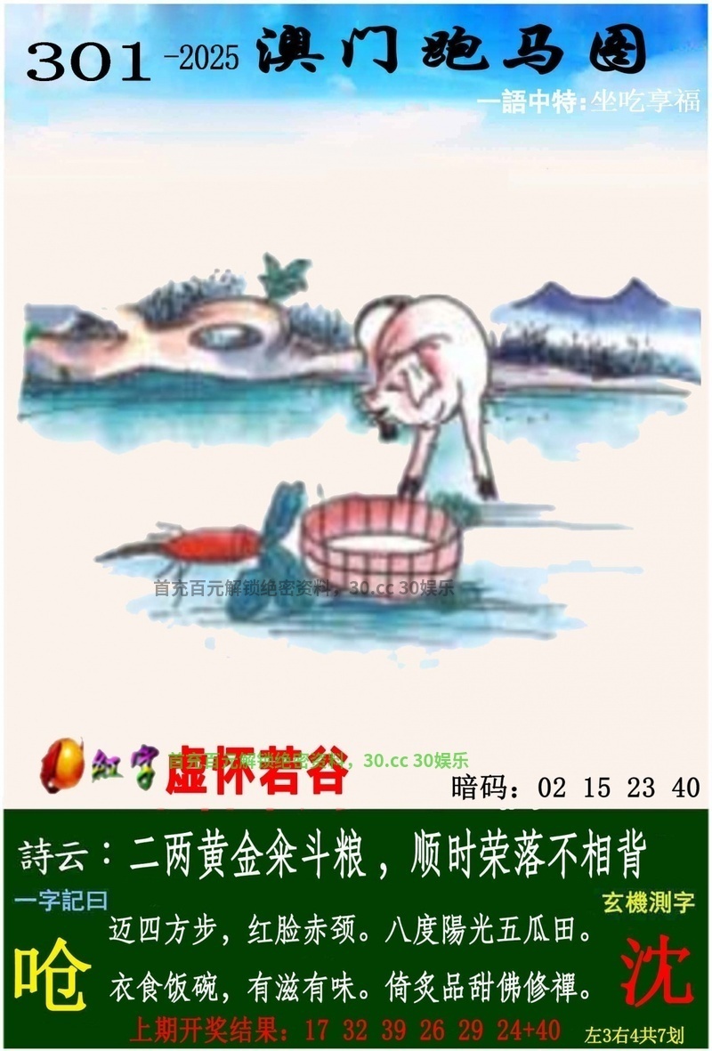 | 303期:七肖 | 兔虎马蛇狗羊猴 | 结果:兔15 |